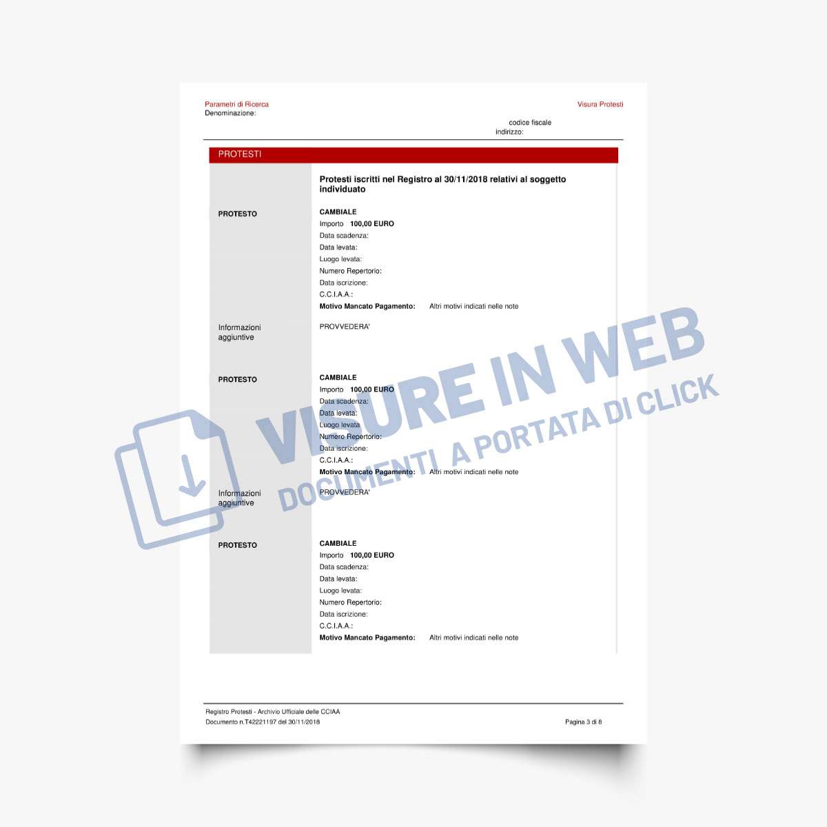 Nel documento sono contenuti tutti i provvedimenti rilevati con relativi dettagli, quali il motivo del mancato pagamento, il tipo di effetto (assegno o cambiale), l’importo, il luogo di apertura, la data di apertura, la Camera di Commercio in cui è iscritta la persona o l’impresa, il numero di repertorio.