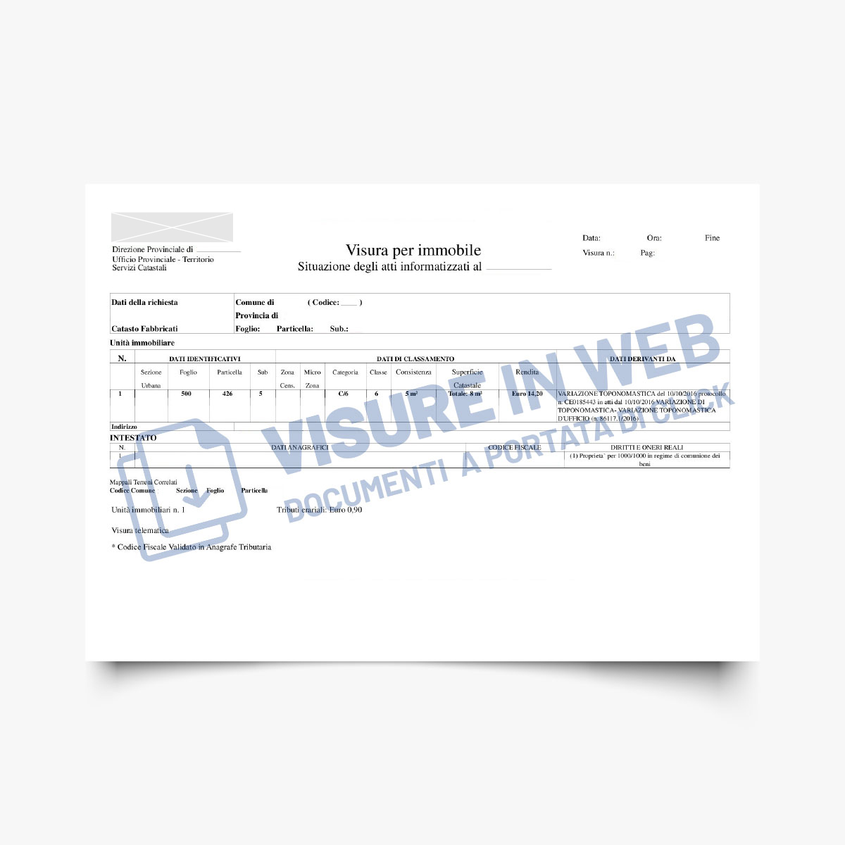 I dati identificativi presenti nella visura sono i dati catastali (foglio particelle subalterni se presenti), dati tecnici (sezioni classi e categoria catastale), la consistenza espressa in vani (metri quadrati o aree a seconda della tipologia di immobile), la rendita, l’ubicazione con provincia comune e indirizzo, i dati anagrafici dei soggetti intestatari.